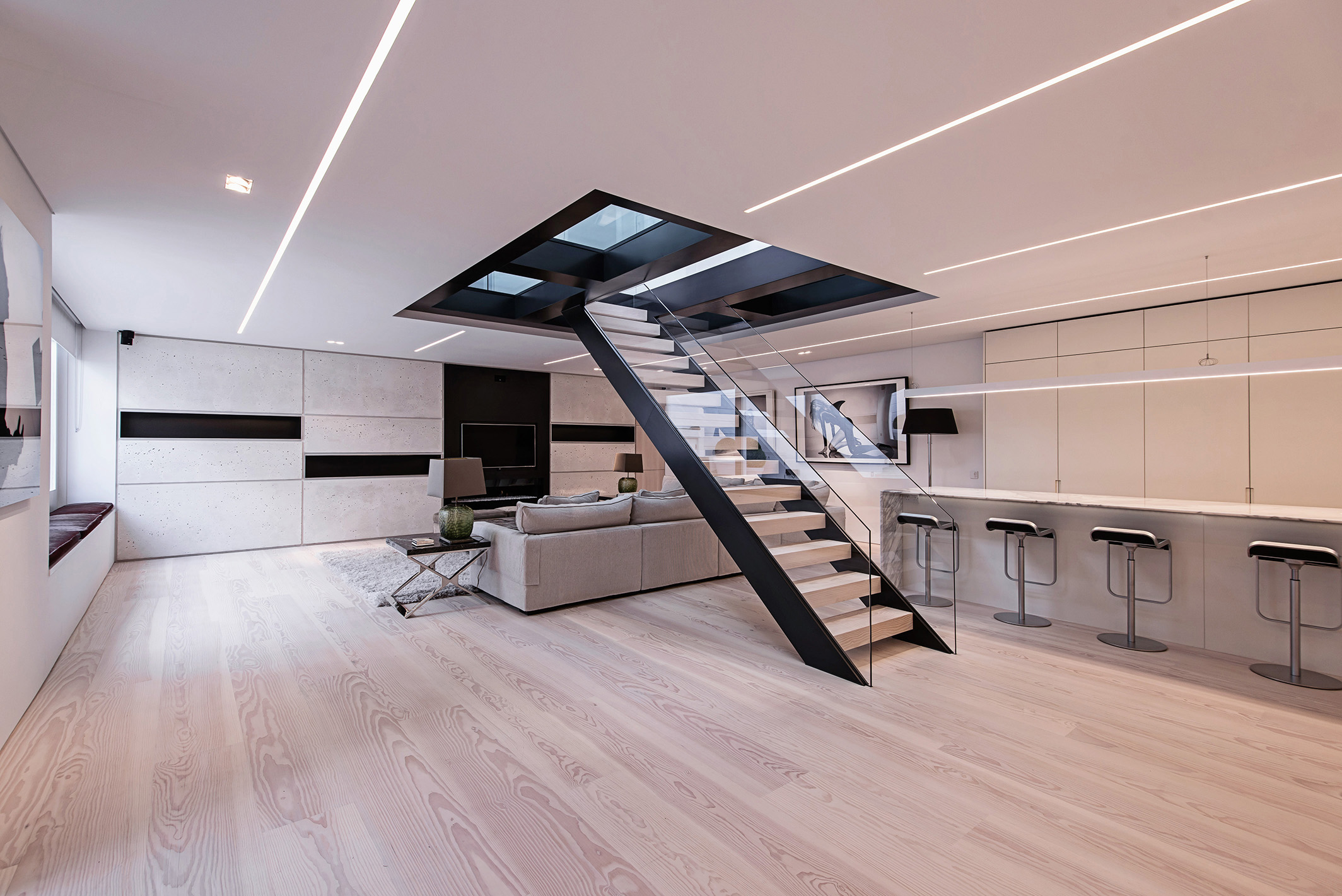 A new glass floor was installed around the central stair to bring light down from above, with the framing clad in aluminium to create a feature from above and below. A new bespoke kitchen, and in-situ cast concrete media wall were also fitted, along with minimal but striking strip lighting to the large ceiling area.