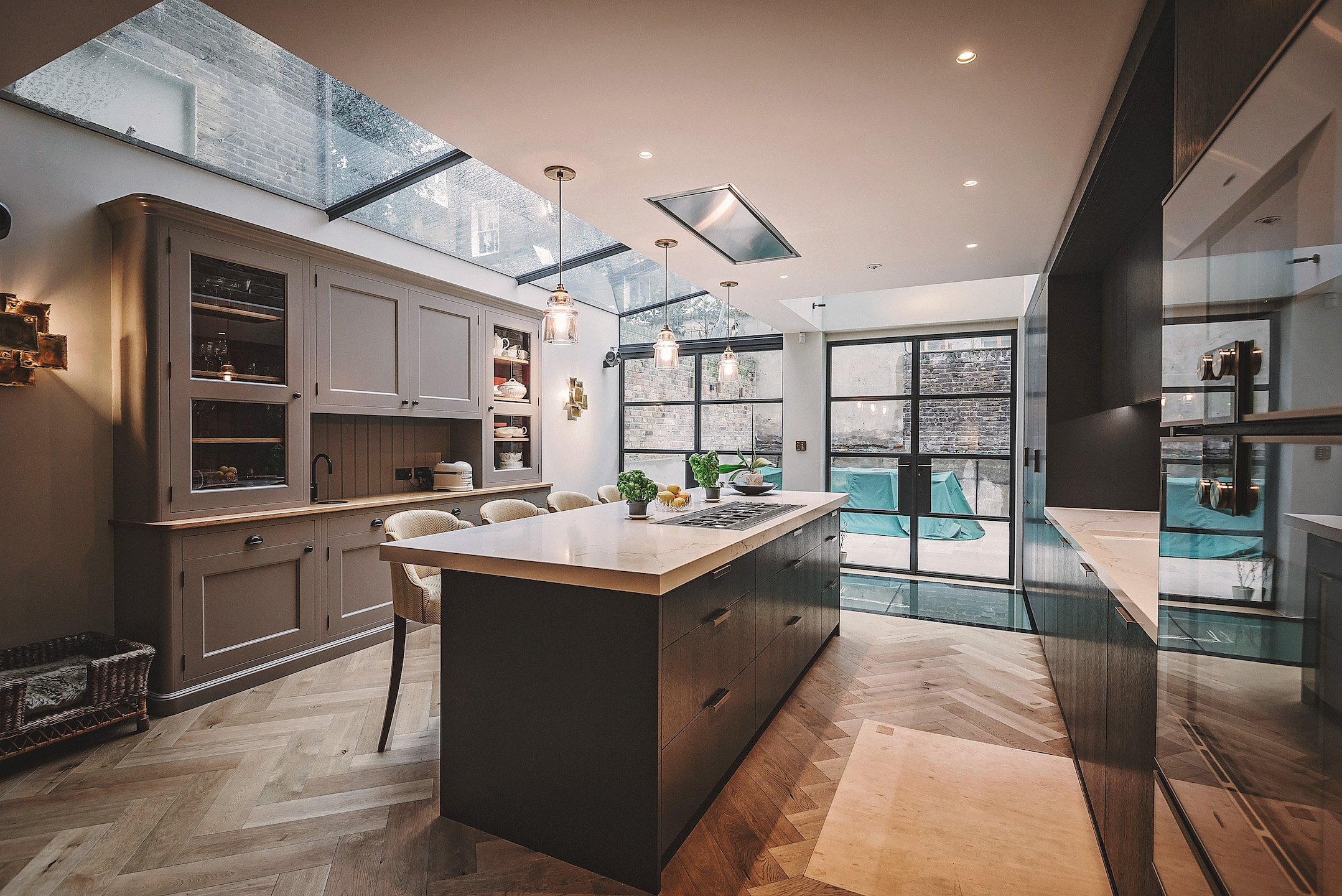 Dark steel framed doors provide access to the external areas and are carried through to provide glazed screens and doors to select internal spaces. A new dark stained timber lined stair provides access to the lower levels, with a new traditional staircase to the upper floors terminating in a large top floor rooflight.