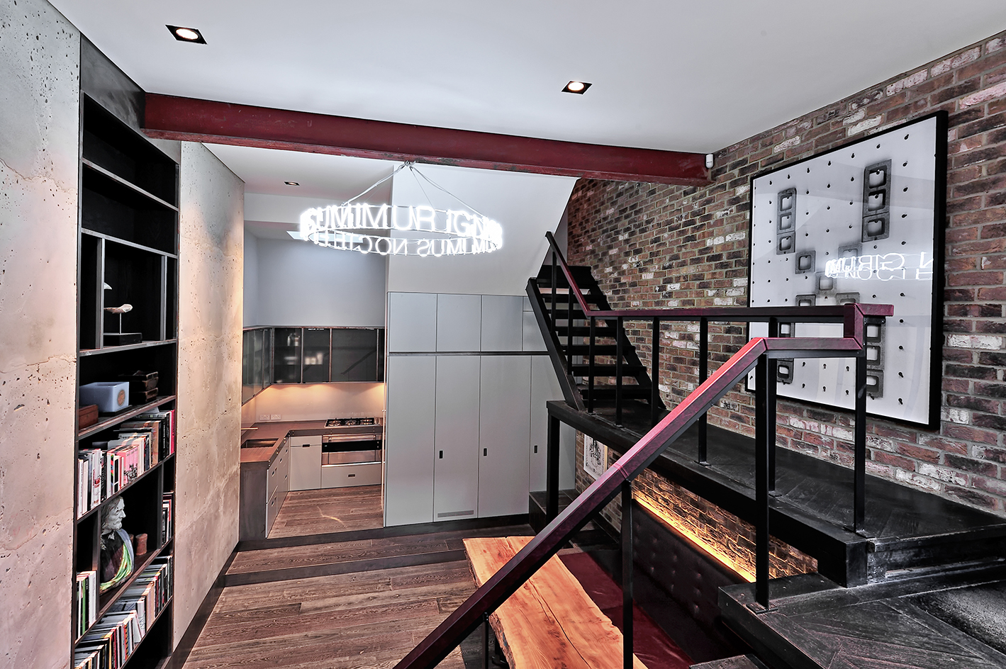 The palette of materials is quite diverse, and includes custom leatherwork and steelwork, along with a restrained LED lighting scheme which for lighting the owners large art collection.