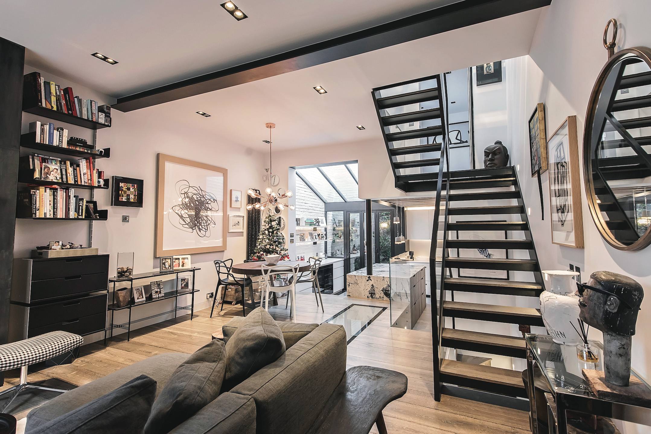 A ground floor glazed in-fill was pulled back in to create a small garden space with green wall, while the kitchen was fully reconfigured. The master suite was re-worked on the first floor, and there were new finishes, flush door-sets, and bespoke joinery fitted throughout.
